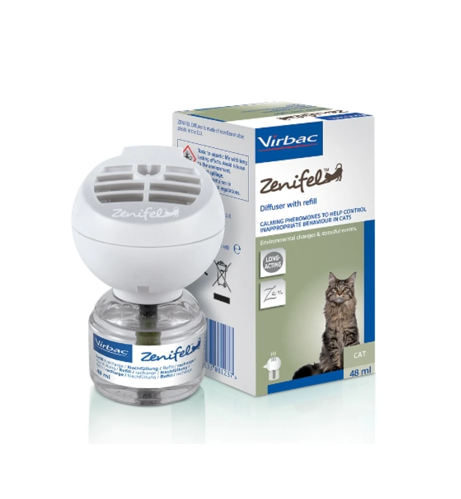 Zenifel van Virbac is een verdamper voor in het stopcontact die ingezet kan worden ter voorkoming van stress bij katten. De Zenifel verdamper zorgt ervoor dat er fermonen verspreid worden die een kalmerend effect hebben op katten. Een flesje van de Zenifel heeft een werkingsduur van 6 weken.